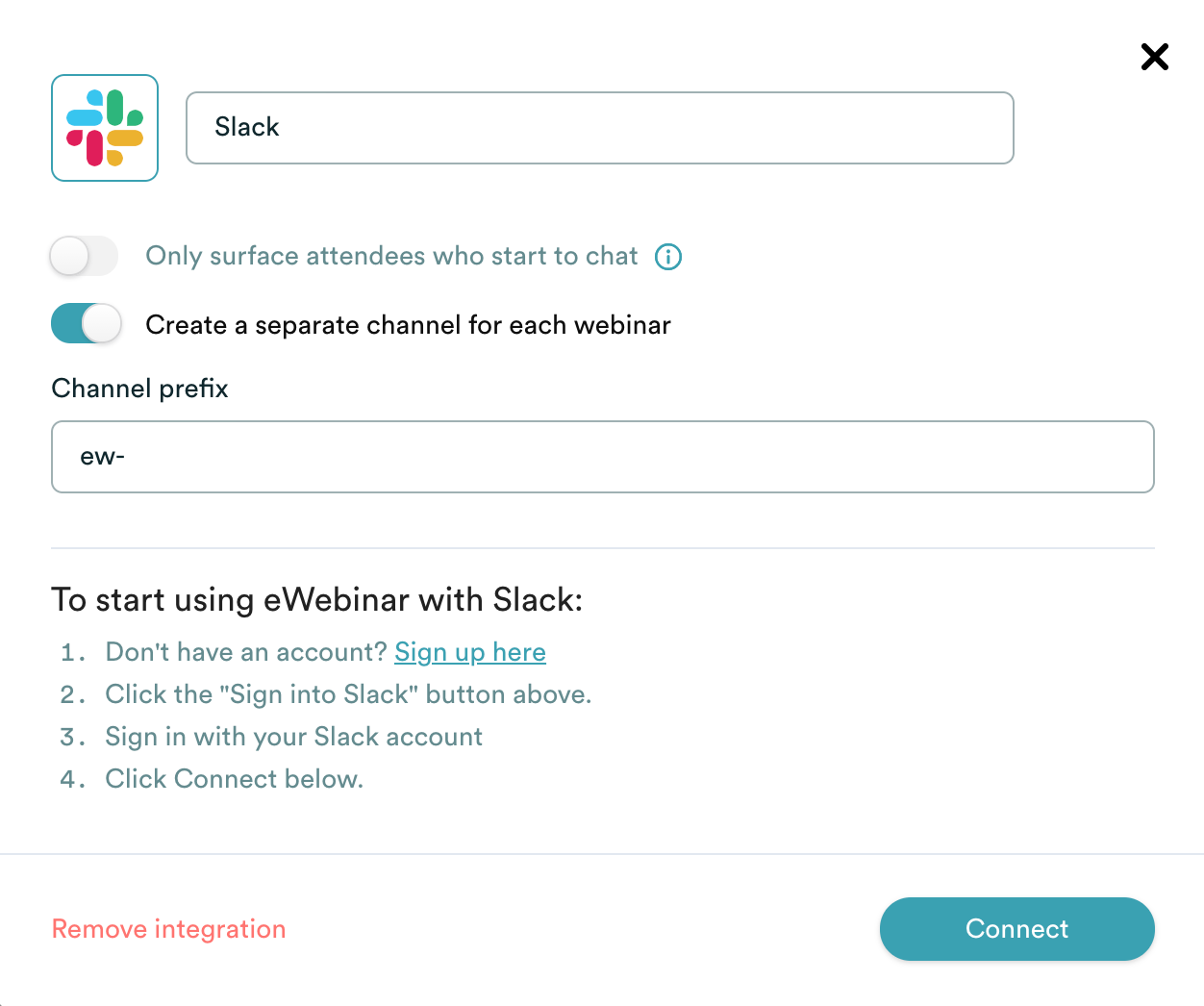 Lorsque vous intégrez eWebinar à Slack, vous serez averti lorsqu'un participant s'inscrit à l'un de vos webinaires ou vous envoie un message de chat, et vous aurez la possibilité de répondre à ses questions depuis Slack. Vous n'aurez plus besoin de vous connecter à eWebinar, vous améliorerez votre temps de réponse et vous rationaliserez votre journée de travail afin de répondre aux messages de chat des participants à vos webinaires automatisés.